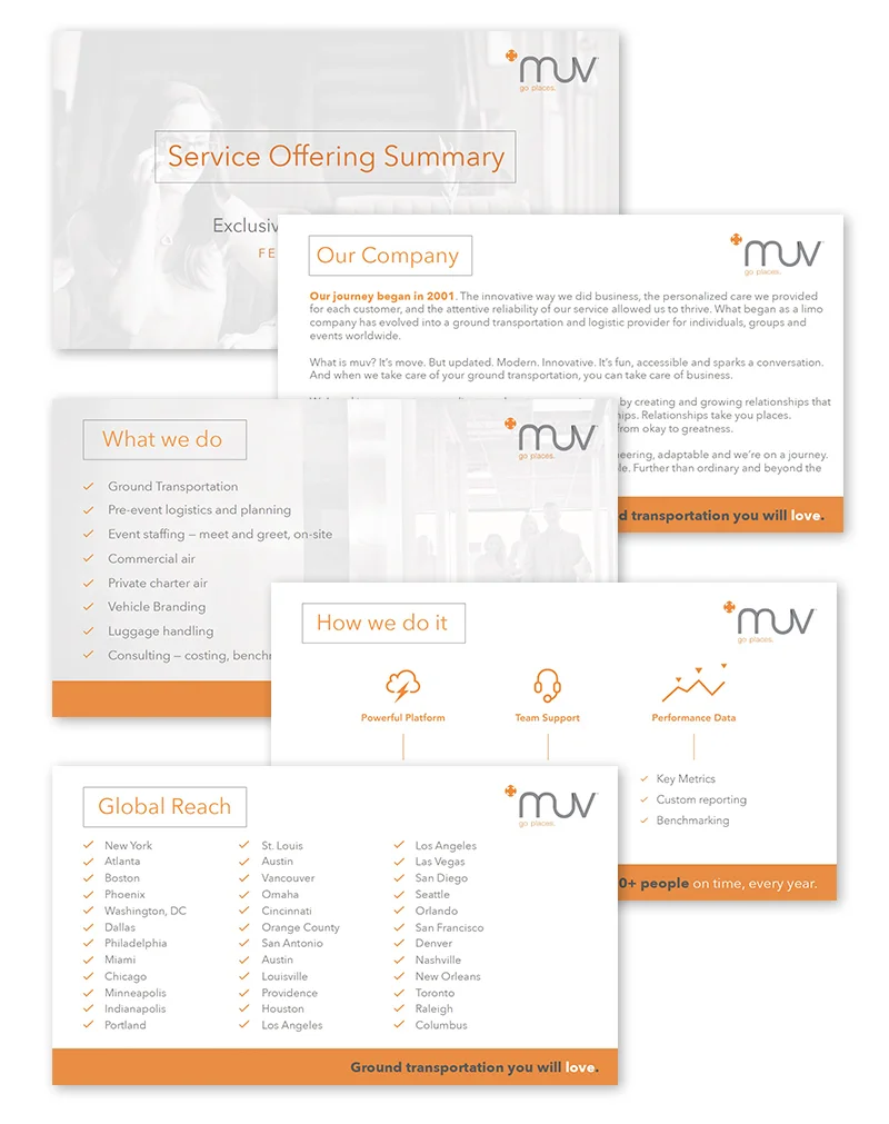 Em-press Design has helped this worldwide ground transportation, travel and logistics provider keep their branding on the move for over 10 years. Using 360Limo’s existing branding, I helped them brand a variety of collateral. After they rebranded as muv, I've developed graphics for their mobile app, signage, sprinter vans, trade show booths, PowerPoint presentations, as well as infographics, maps and holiday email greetings..